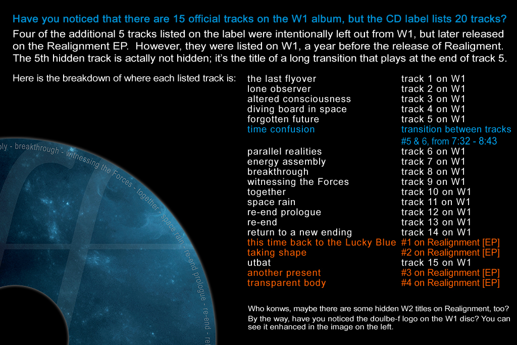 forgotten future: W1 contains over two dozens of hidden details, references and symbols. You can discover 5 of them in the music itself, and the physical CD & booklet features 13 hidden, although visible details. The digital booklet includes 9 of these 13 visible features, but also adds another 7 that are not found on the printed packaging.
