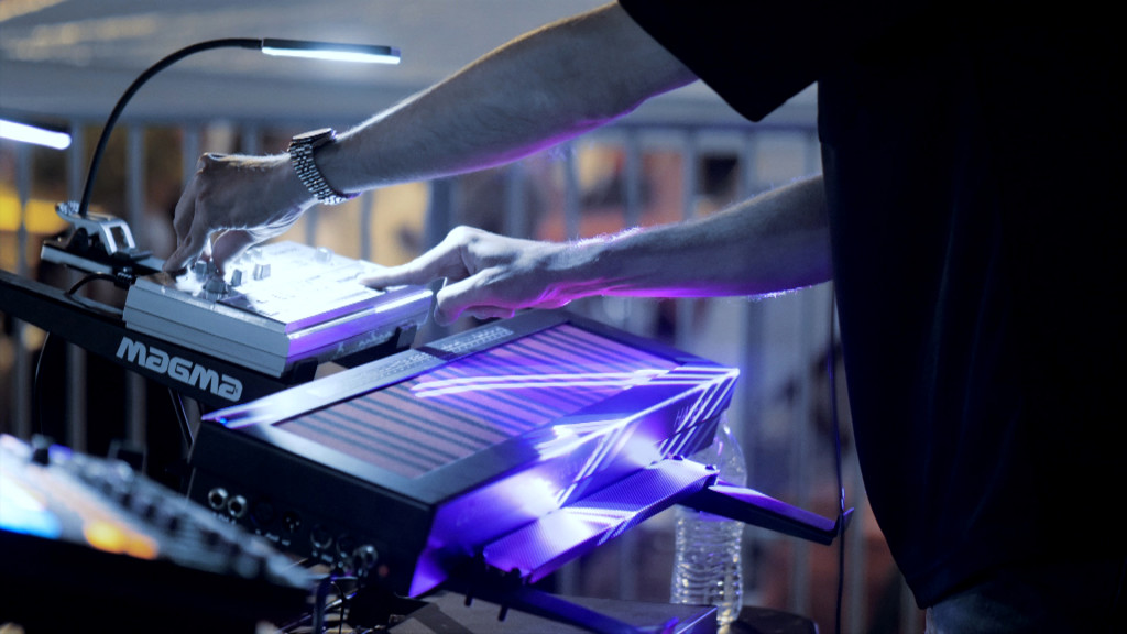 Several instrumental parts and effects are performed live on unique electronic instruments, sequences are triggered real-time over custom show mixes, while synchronized video projection and laser complete the show aesthetics.